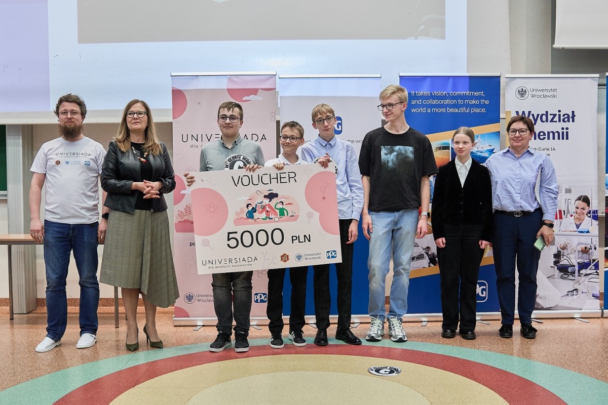 Laureaci 3. miejsca z SP nr 1 we Wrocławiu - Universiada 2024. Fot. PPGPPG (NYSE: PPG) poinformowała dzisiaj, że wyłoniono zwycięskie zespoły 2. edycji konkursu Universiada. Pierwsze miejsce i 5000 zł przyznano drużynie ze SP nr 8 w Oławie, drugie miejsce i 2500 zł trafiło do zespołu ze Szkoły Podstawowej w Mysłakowicach, a trzecie miejsce i 1000 zł zdobył zespół z SP nr 1 we Wrocławiu. Inicjatorem i sponsorem przedsięwzięcia jest firma PPG, program realizowany jest w partnerstwie z wrocławskim oddziałem Stowarzyszenia Inżynierów i Techników Przemysłu Chemicznego, pod patronatem Rektora Uniwersytetu Wrocławskiego oraz patronatem merytorycznym uczelni. Łączny budżet projektu wyniósł 130 tys. zł.