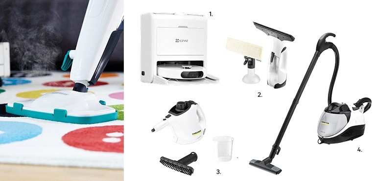 Zdj. ilustracyjne: Mop parowy Cleantenso Leifheit 709,00 zł, kod 45928771, 1. Robot sprzątający RS2 EZVIZ 3299,00 zł, kod 88042312, 2. Myjka do szyb WV 2 Plus Karcher 329,00 zł, kod 90201905, 4. Odkurzacz parowy SV 7 2200W 4 bar Karcher 3149,00 zł, kod 90705211, 3. Parownica SC1 3 bar 1200 W Karcher 355,00 zł, kod 90691071. Fot. Leroy MerlinSmart home na 26 maja