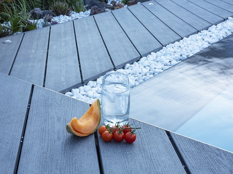 Innym przykładem, który posłuży długie lata, jest kolekcja Line marki Gardin. To koekstrudowane komorowe deski kompozytowe drugiej generacji na bazie żywicy PVC. Uwagę przykuwa ich efektowna szerokość - aż 18 cm. A ona z kolei przekłada się na elegancki wygląd przy umiejscowieniu wzdłuż basenu. Deski dostępne w długości na wymiar. To również tańszy montaż — nawet o 24%. Mniej klipsów, mniej pracy. Ryflowana oraz szczotkowana powierzchnia odprowadza wodę i działa antypoślizgowo.