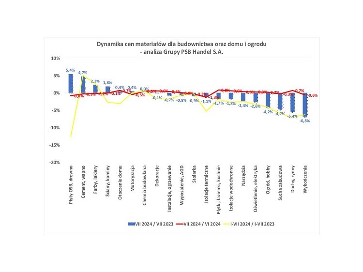 Ceny towarów w lipcu 2024 r., w stosunku do lipca 2023 r., wzrosły w 6 grupach towarowych: płyty OSB, drewno i cement, wapno (po +5%), farby, lakiery i ściany, kominy (po +2%), motoryzacja oraz otoczenie domu (po +0,4%). Nie zmieniły się ceny w kategorii chemia budowlana. Spadek cen nastąpił w 13 kategoriach. Do 1% spadły ceny w grupach: dekoracje, instalacje, ogrzewanie, wyposażenie, AGD, stolarka oraz izolacje termiczne. W kolejnych grupach spadki były następujące: płytki, łazienki, kuchnie, izolacje wodochronne i narzędzia (po -2%), oświetlenie, elektryka (-3%), ogród i hobby (-4%), sucha zabudowa oraz dachy, rynny (po -5%). Największy spadek miał miejsce w kategorii wykończenia (-7%).