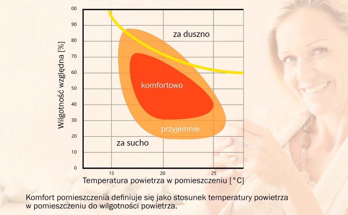 Obok temperatury bardzo ważną rolę w kształtowaniu przyjaznego mikroklimatu odgrywa także wilgotność powietrza. Jest ona ważna dla dobrego samopoczucia zarówno ludzi, jak i zwierząt. Z idealną sytuacją mamy do czynienia wówczas, gdy jej poziom mieści się w przedziale między 40 a 60%. Każda inna wartość, utrzymująca się przez dłuższy czas, może powodować nieprzyjemne dolegliwości. Gdy powietrze jest suche, możemy odczuwać bóle głowy, kaszel, trudności w oddychaniu czy suchość i podrażnienie oczu. Zbyt wilgotne tworzy natomiast idealne warunki dla rozwoju grzybów, w tym pleśni. Pojawiają się one na ścianach i sufitach zwykle w postaci czarnych wykwitów, wpływając niekorzystnie na estetykę pomieszczeń, jednak o wiele poważniejszym problemem jest ich negatywne oddziaływanie na nasze zdrowie. Wdychanie ich zarodników o połowę zwiększa ryzyko rozwoju astmy. O jedną trzecią wzrasta też ryzyko wystąpienia alergii.
