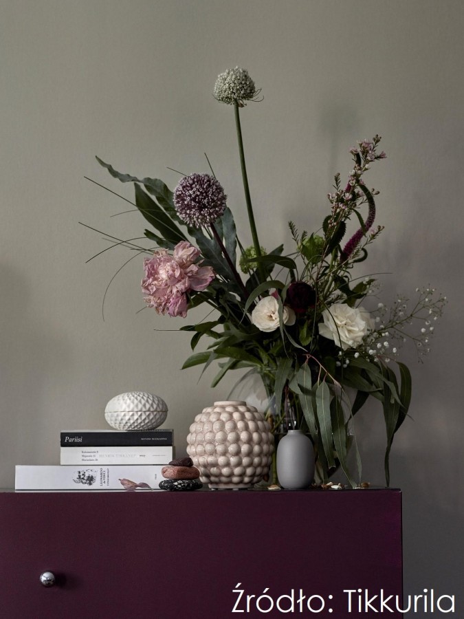 Intensywność jesienno-zimowych odcieni wymaga odwagi, by wprowadzić je do wystroju, szczególnie na dużych powierzchniach. Kompromis stanowi wykorzystanie ich w pojedynczych elementach wyposażenia czy w detalach. Prosta w formie szafka pomalowana emalią Tikkurila Everal Aqua na głęboki, wyrafinowany odcień M425 Beetroot nabierze oryginalności, zapewniając intrygujący kolorystyczny akcent w pomieszczeniu. Naturalny beżowo-szary ton na ścianach zapewni przyjemne tło, na pierwszy plan wysuwając niebanalny odcień mebla. Optymalnym rozwiązaniem jest też zastosowanie wyrazistych, będących w trendzie na jesień i zimę tonów na pojedynczych ścianach. Pomalowanie jednej z nich soczystą zielenią, np. Zielony Butelkowy od Dekoral, podczas gdy resztę ścian pokrywa klasyczny beż, bezbłędnie ożywia wnętrze i nadaje mu wyjątkowy styl. Naturalnym uzupełnieniem wdzięcznego wystroju są plecionki, drewno i rośliny, które sprawiają, że wnętrze emanuje spokojem i niewymuszonym urokiem.