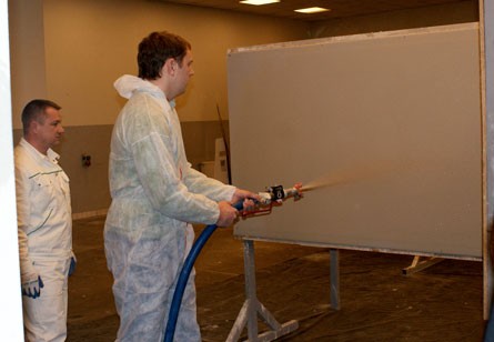 Kolejną grupą produktów, z jaką zapoznano białoruskich doradców, były wyroby gipsowe DOLINY NIDY. Marek Tomasik mówił m.in. o systemie silosowym, technologii tynków maszynowych, po czym przeprowadził zajęcia praktyczne – za pomocą agregatu każdy mógł nanieść na ścianę gips szpachlowy.