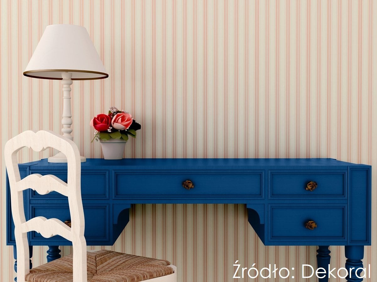 Jeśli biurko nie jest cennym antykiem czy wiekową pamiątką rodzinną, ale zgrabnym, stylizowanym na mebel z epoki egzemplarzem, można bez żalu zaplanować dla niego zupełnie nowy, a nawet ekstrawagancki kolor. Taki jak np. kobalt „Jakiś kosmos” z palety Dekoral Express Top. Po metamorfozie kontrastowy głęboki odcień biurka ustawionego na tle tapety w subtelne prążki będzie przyciągał wzrok i nada wnętrzu niebanalny charakter.