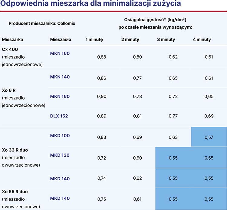* Osiągalne gęstości lub objętości oraz wynikające z nich zużycie zostały określone w praktyce lub w laboratorium w optymalnych warunkach. Oprócz użytego mieszadła i czasu mieszania, wpływ na osiągalną gęstość i wydajność mają również ruch mieszadła w pojemniku (im częściej i dłużej głowica mieszająca jest poza mieszanką, tym większy jest pobór powietrza) oraz warunki klimatyczne. Wszystkie podane powyżej dane są zatem wartościami przybliżonymi i nie są wiążące.