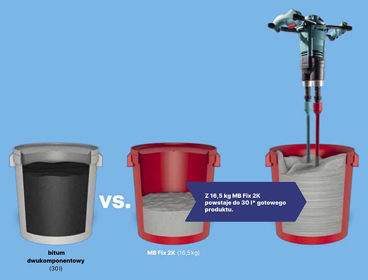 Chociaż opakowanie MB Fix 2K zawiera tylko 16,5 kg materiału, jego innowacyjna formuła sprawia, że jest równie wydajny jak tej samej wielkości opakowanie masy bitumicznej stosowanej do klejenia do płyt termoizolacyjnych! Łatwo to osiągnąć, używając do mieszania najlepszych narzędzi oraz odpowiedniego czasu i techniki. Odpowiednie mieszanie MB Fix 2K pozwala znacznie zwiększyć jego objętość. Gęstość jest praktycznie o połowę mniejsza: z 1,1 kg/dm³ spada do ok. 0,55 kg/dm³.