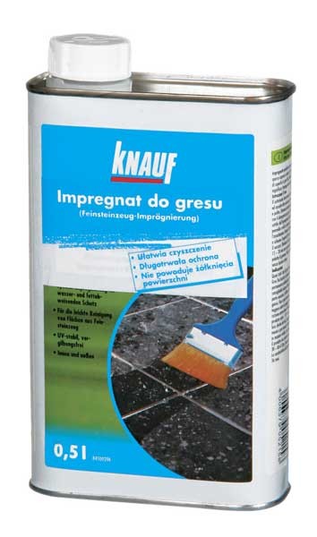 Knauf - impregnat do gresu nie zmienia oryginalnych właściwości płytek i nie zakleja w nich porów, umożliwiając prawidłowe odparowywanie wilgoci z podłoża. Nie zawiera silikonu i szybko schnie. Impregnat można stosować do nieglazurowanych płytek, kamienia naturalnego, zarówno wewnątrz jak i na zewnątrz. Impregnat ułatwia czyszczenie, nie powoduje żółknięcia powierzchni, chroni gres przed wodą i tłustymi zabrudzeniami, chroni przed działaniem promieni UV.