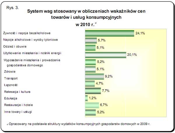 System wag oparty jest na strukturze wydatków gospodarstw domowych na zakup towarów i usług konsumpcyjnych z roku poprzedzającego rok badany, uzyskanej z badania budżetów gospodarstw domowych. W świetle tych badań w wydatkach konsumpcyjnych gospodarstw domowych w 2009 r. nastąpiły zmiany w poszczególnych grupach mających istotne znaczenie w strukturze konsumpcji.