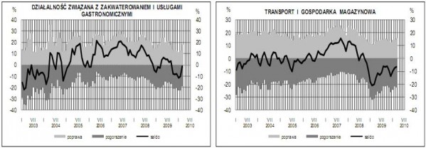 Dyrektorzy tych przedsiębiorstw przewidują, że popyt na usługi i ich sprzedaż utrzyma się na korzystnym poziomie sprzed miesiąca. W konsekwencji przyszła sytuacja finansowa może się poprawiać. Bieżąca sprzedaż, a także sytuacja finansowa jednostek, oceniane są nieco mniej optymistycznie niż przed miesiącem przy utrzymujących się pozytywnych opiniach dotyczących popytu. Sygnalizowany jest wolniejszy niż w lutym wzrost bieżących cen, w najbliższych miesiącach ich wzrost może utrzymać się na poziomie prognozowanym w lutym. Można się spodziewać niewielkiego wzrostu zatrudnienia w tej grupie jednostek. Spośród badanych przedsiębiorstw usługowych, w marcu 2,7% (tak jak w analogicznym miesiącu przed rokiem) deklaruje, że nie odczuwa żadnych barier w prowadzeniu bieżącej działalności. Największe trudności napotykane przez przedsiębiorstwa zgłaszające bariery związane są z konkurencją firm krajowych (77% w marcu, 80% w marcu 2009 r.). W porównaniu z analogicznym okresem ubiegłego roku w największym stopniu spadło znaczenie bariery związanej z konkurencją firm zagranicznych (z 53% do 46%).