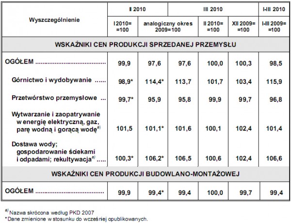W marcu 2010 r. ceny produkcji sprzedanej przemysłu były o 2,4% niższe niż przed rokiem. Obniżono ceny w przetwórstwie przemysłowym (o 4,2%). Podniesiono natomiast ceny w sekcjach: wytwarzanie i zaopatrywanie w energię elektryczną, gaz, parę wodną i gorącą wodę (o 1,6%), dostawa wody; gospodarowanie ściekami i odpadami; rekultywacja (o 6,5%) oraz w górnictwie i wydobywaniu (o 13,7%).