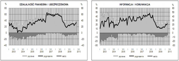 W kwietniu wskaźnik ogólnego klimatu w sekcji informacja i komunikacja kształtuje się na poziomie plus 22 (w marcu plus 19). Poprawę koniunktury odnotowuje 28% badanych firm, a jej pogorszenie – 6% (w marcu odpowiednio 28% i 9%). Pozostałe jednostki uznają, że ich sytuacja nie ulega zmianie. Na poprawę wskaźnika ogólnego klimatu koniunktury wpływają lepsze od formułowanych przed miesiącem oceny bieżące i prognozy popytu i sprzedaży oraz bardziej optymistyczne przewidywania dotyczące sytuacji finansowej. Mimo to aktualna sytuacja finansowa oceniana jest nieco mniej korzystnie niż w marcu. Sygnalizowane jest utrzymanie spadku zarówno bieżących jak i przewidywanych cen. Dyrektorzy jednostek planują ograniczyć zatrudnienie w stopniu nieco mniejszym niż prognozowano przed miesiącem. W kwietniu 3,6% badanych przedsiębiorstw deklaruje, że nie napotyka na bariery w prowadzeniu swojej bieżącej działalności (w kwietniu przed rokiem odsetek ten wyniósł 7,7%). Największe trudności napotykane przez firmy zgłaszające bariery związane są z konkurencją firm krajowych (56% w kwietniu, 47% przed rokiem) – jest to bariera, której znaczenie w skali roku wzrosło w największym stopniu. W porównaniu z kwietniem 2009 roku w największym stopniu zmniejszyło się znaczenie bariery związanej z konkurencją firm zagranicznych (z 16% do 7%).