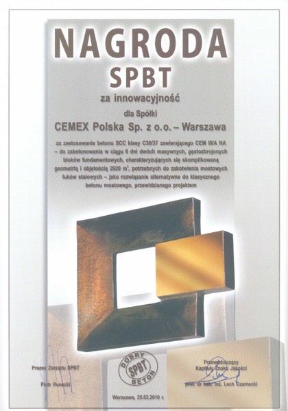 Nagroda SPBT za innowacyjność dla Spółki CEMEX Polska Sp. z o.o. - Warszawa...za zastosowanie betonu SCC klasy C30/37 zawierającego CEM III/A NA do zabetonowania w ciągu 6 dni dwóch masywnych, gęstozbrojonych bloków fundamentowych, charakteryzujących się skomplikowaną geometrią i objętością 2920 m3, potrzebnych do zakotwienia mostowych łuków stalowych - jako rozwiązanie alternatywne do klasycznego betonu mostowego przewidzianego projektem.