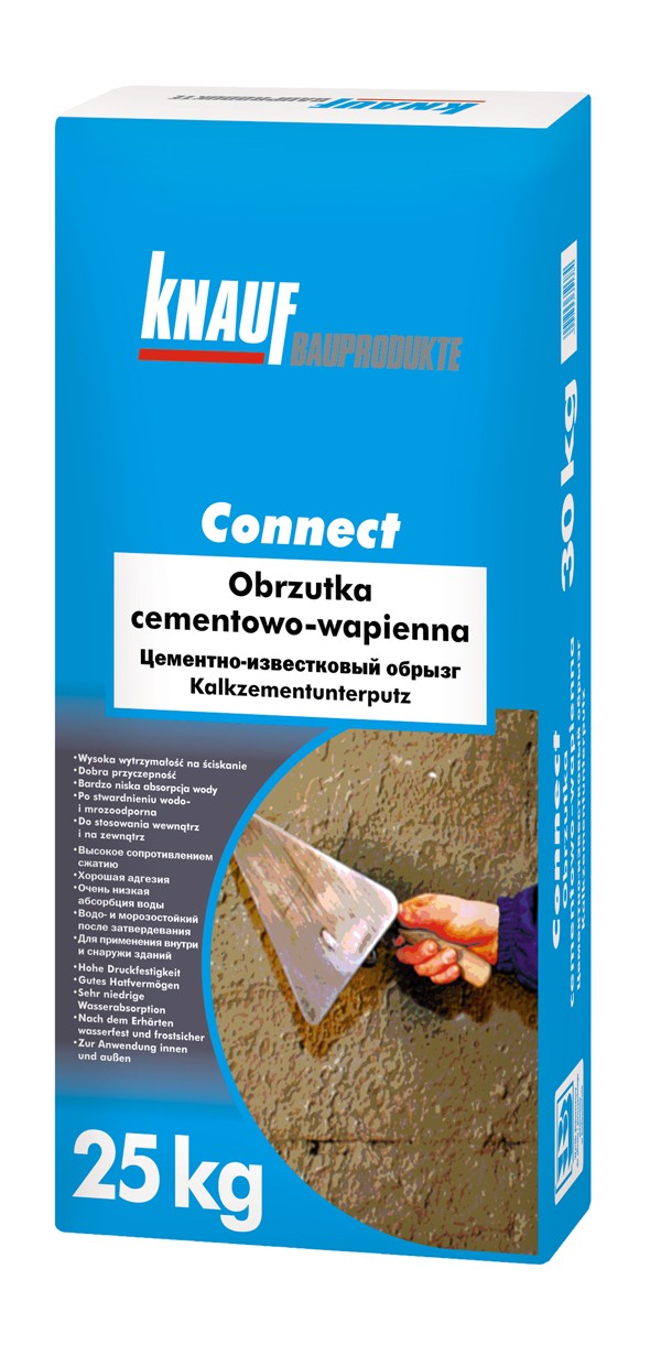 Knauf Connect Obrzutka cementowo-wapienna przeznaczona jest do maszynowego lub ręcznego wykonania tradycyjnej obrzutki tynkarskiej pod tynki podkładowe.
