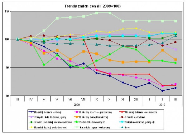 W marcu 2010 r., w porównaniu do poprzedniego miesiąca, wzrosły ceny w 4 grupach towarowych, w 3 spadły, a w 4 nie zmieniły się. Wzrost zanotowano w drewnie i materiałach drewnopochodnych (+1,5%), silikatach (+1,3%), chemii budowlanej (+1,2%) i gazobetonach (+0,9%). Spadły ceny materiałów izolacji termicznej (-3,5%), pokryć i folii dachowych, rynien (-1,7%) i suchej zabudowy (-0,8%).