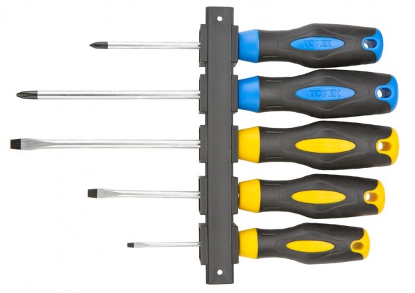 Wśród narzędzi ręcznych marki TOPEX pojawiły się nowe wkrętaki o końcówkach płaskich, krzyżowych PH i PZ oraz typu Torx. Zróżnicowane rozmiary oraz kształty końcówek pozwalają na dokładne dopasowanie wkrętaka do łba śruby, co zapobiega szybkiemu niszczeniu się zarówno łba, jak i grota narzędzia. Dużą wytrzymałość grotów uzyskano dzięki wykorzystaniu wysokiej jakości stali chromowo – wanadowej (CrV). Końcówkę roboczą grota poddano także procesowi hartowania, co dodatkowo podnosi jej twardość. Rękojeść nowych wkrętaków TOPEX została wykonana z dwóch materiałów – twardego tworzywa wewnątrz, oraz miękkiego elastomeru na zewnątrz. Takie rozwiązanie pozwala na zachowanie odpowiedniej wytrzymałości, przy jednoczesnej wygodzie chwytu. Ergonomiczny profil rękojeści pozwala na komfortową pracę narzędziem. Końcówki wszystkich wkrętaków zostały namagnesowane, dzięki czemu po wykręceniu śruba nie spadnie na ziemię. Jest to szczególnie przydatne podczas pracy w trudno dostępnych miejscach. Dużym ułatwieniem dla użytkownika jest oznaczenie rękojeści różnymi kolorami, w zależności od rodzaju końcówki: - płaskiej kolorem żółtym,