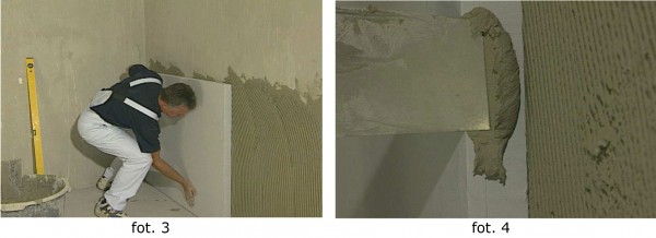 Pierwszą płytę zaleca się dostawić do dolnego rogu ściany, a następnie lekko ją dociskając wypoziomować ( fot.3 ). Płytę przyklejamy stroną ryflowaną tak, aby możliwie jak największą swoją powierzchnią przylegała do ściany. Następną płytę montujemy podobnie, nie zapominając jednak o tym, by krawędzie płyt łączyć ze sobą klejem ( fot. 4 ). Dlatego też kolejną dostawioną płytę dociskamy do kantu z naniesionym klejem na poprzedniej płycie ( fot. 5 ). Przy klejeniu należy również pamiętać, by nie powstawały fugi w kształcie krzyży. Po tak wykonanym montażu należy kantem szpachelki „sfazować” wszystkie łączenia płyt ( fuga ok. 1 cm ). Płyty montowane do sufitu dodatkowo mocujemy na dyble talerzowe.