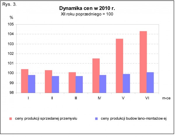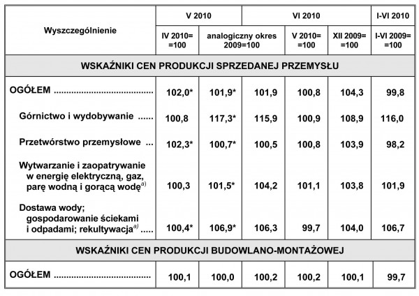 W czerwcu 2010 r. ceny produkcji sprzedanej przemysłu były o 1,9% wyższe niż przed rokiem. Najbardziej wzrosły ceny w górnictwie i wydobywaniu (o 15,9%). Podniesiono również ceny w sekcjach: dostawa wody; gospodarowanie ściekami i odpadami; rekultywacja (o 6,3%), wytwarzanie i zaopatrywanie w energię elektryczną, gaz, parę wodną i gorącą wodę (o 4,2%) oraz w przetwórstwie przemysłowym (o 0,5%). Szacuje się, że ceny produkcji budowlano-montażowej w czerwcu 2010 r. były o 0,2% wyższe niż w poprzednim miesiącu. Zanotowano wzrost cen budowy budynków, budowy obiektów inżynierii lądowej i wodnej (po 0,2%) oraz robót budowlanych specjalistycznych (o 0,1%).