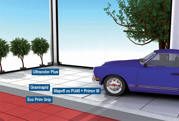 Rozwiązanie szybkie:1. Przygotowanie podłożaGrunt: Eco Prim Grip Uniwersalny, gotowy do użycia preparat gruntujący na bazie żywic akrylowych i kruszywa kwarcowego, o wysokiej przyczepności do powierzchni gładkich i nienasiąkliwych oraz bardzo niskiej emisji lotnych substancji organicznych (VOC). Odkształcalna zaprawa klejąca: Granirapid Odkształcalna, dwuskładnikowa, szybkowiążąca i szybkoschnąca cementowa zaprawa klejąca do montażu kamienia naturalnego i syntetycznego, płytek ceramicznych i gresu, wewnątrz i na zewnątrz. Grubość warstwy do 10 mm. 2. Montaż okładzin ceramicznychZaprawa do spoinowania: Ultracolor Plus Elastyczna, szybkowiążąca i szybkoschnąca, odporna na ścieranie cementowa zaprawa do wypełniania szczelin od 2 do 20 mm, bez plam i wykwitów, o właściwościach hydrofobowych, z efektem perlenia DropEffect® oraz w technologii BioBlock®, zapobiegającej rozwojowi grzybów i pleśni. Dostępna w 30 kolorach. Uszczelniacz do narożników i dylatacji: Primer M Preparat gruntujący do krawędzi szczelin, poprawiający przyczepność uszczelniacza Mapefl ex PU45. Mapefl ex PU45 Jednokomponentowa masa poliuretanowa o właściwościach tiksotropowych, o odkształcalności do 20%. |