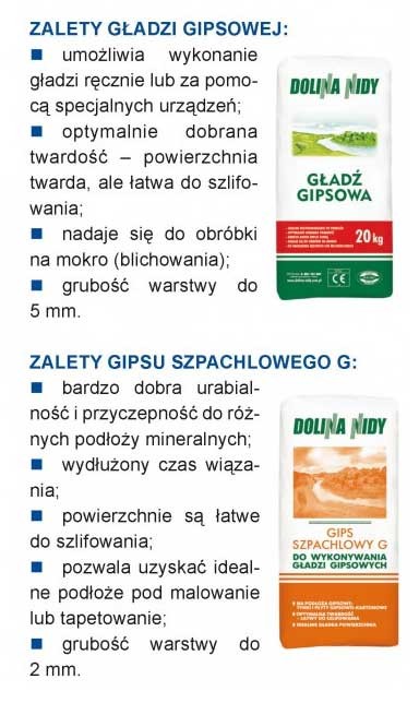 Idealną powierzchnię wykańczanych ścian gwarantują produkty gipsowe DOLINY NIDY - od gipsów szpachlowych i budowlanych, klejów do płyt gipsowo-kartonowych, poprzez gładzie, po tynki. Te ostatnie wykonuje się coraz częściej z uwagi na możliwość uzyskania stosunkowo niskim kosztem powierzchni o wysokiej jakości. Wszystkie produkty maksymalnie ułatwiają pracę zarówno doświadczonym wykonawcom, jak i tym, którzy przeprowadzają prace remontowe we własnym zakresie.