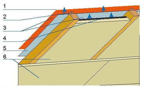 W przypadku folii niskoparoprzepuszczalnej konieczne są dwie szczeliny wentylacyjne. 1 – pokrycie dachu, 2 – łaty, 3 – szczeliny wentylacyjne, 4 – sznurek, 5 – folia wiatroizolacyjna, 6 – izolacja termiczna.Wiatroizolacja