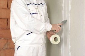 Wtapianie taśmy. W świeżo nałożonej masie GIPSAR MAX zatapiamy taśmę zbrojącą, która ograniczy możliwość pękania połączenia płyt g-k. Fot. ATLAS