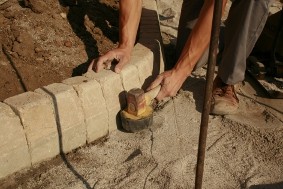 Układanie elementów brzegowych Wykonanie podbudowy polega na rozścielaniu kruszywa lub innego materiału drogowego i ubijaniu go do odpowiedniego stopnia zagęszczenia. Grubość tej warstwy zależy od rodzaju podłoża oraz przewidywanego obciążenia. W przypadku nawierzchni wokół domów oraz chodników z reguły wystarcza ok. 20 cm (ciągi piesze).