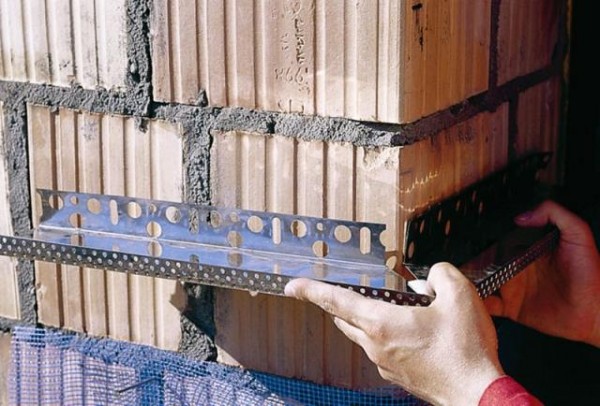 Na ocieplone wełną ościeże nakładamy listwę narożną z siatką. Siatkę zatapiamy równo z brzegiem listwy.