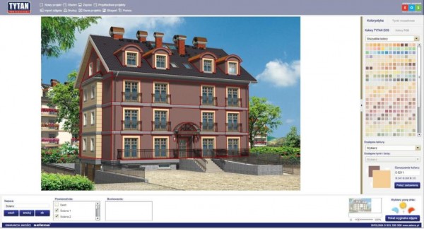 Program „ POKOLORUJ SWÓJ DOM” Fot. Tytan ProfessionalZ programu „Pokoloruj swój dom” można korzystać bezpłatnie za pośrednictwem strony internetowej www.selena.pl. Aplikacja nie wymaga instalacji, a do jej użytkowania wystarczy komputer podłączony do sieci. „Pokoloruj swój dom” umożliwia przetestowanie kilkuset kolorów i wzorów tynków Tytan EOS, co pozwala wybrać produkt, który najlepiej zaprezentuje się na Twoim budynku. Program jest prosty w obsłudze, jednak wyposażono go w rozbudowane funkcje. Dzięki niemu można np. zaobserwować, jak wybrany kolor zmienia się wraz z porą dnia, czy sprawdzić, jak elewacja wyglądałaby z elementami boniowania.