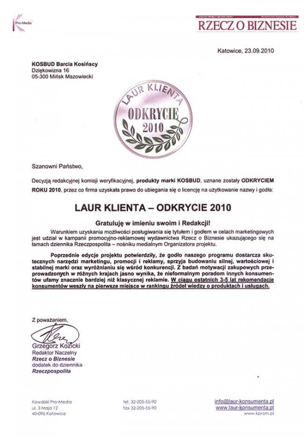 Decyzją redakcyjnej komisji weryfikacyjnej, produkty marki Kosbud, uznane zostały Odkryciem Roku 2010, przez co firma uzyskała prawo do ubiegania się o licencję na użytkowanie nazwy i godła: Laur Klienta – Odkrycie 2010Warunkiem uzyskania możliwości posługiwania się tytułem i godłem w celach marketingowych jest udział w kampanii promocyjno-reklamowej wydawnictwa Rzecz o Biznesie ukazującego się na łamach dziennika Rzeczpospolita – nośniku medialnym Organizatora projektu
