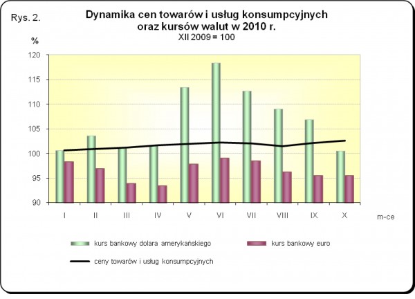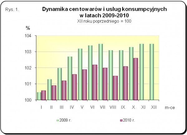 Ceny towarów i usług konsumpcyjnych w październiku 2010 r., w stosunku do poprzedniego miesiąca, wzrosły o 0,5%. W poszczególnych grupach towarów i usług konsumpcyjnych odnotowano zróżnicowaną dynamikę cen. Największy wpływ na wskaźnik cen towarów i usług konsumpcyjnych ogółem miały w tym okresie podwyżki cen żywności (o 1,1%), a także opłat związanych z mieszkaniem (o 0,5%), które podwyższyły wskaźnik odpowiednio o 0,24 pkt proc. i o 0,13 pkt proc. Spadek opłat w zakresie rekreacji i kultury (o 0,6%) obniżył ten wskaźnik o 0,05 pkt proc.