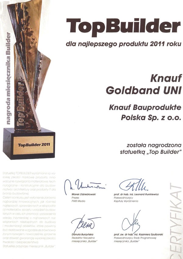 Drugą statuetką uhonorowano także tegoroczną nowość w portfolio firmy – produkt Knauf Goldband Gładź szpachlowa, który nadaje się do tworzenia idealnie gładkich i równych powierzchni wewnątrz budynku.