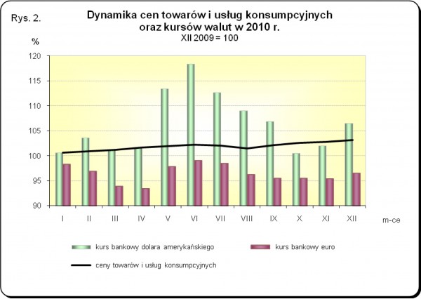 Wzrost cen towarów i usług konsumpcyjnych w 2010 r. w stosunku do roku poprzedniego wyniósł 2,6% (wobec odpowiednio 3,5% w 2009 r.) i był wyższy od założonego w ustawie budżetowej o 1,6 pkt proc.
