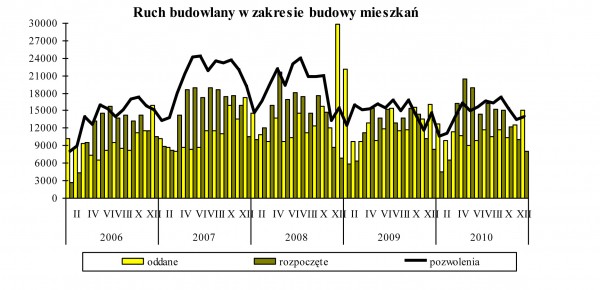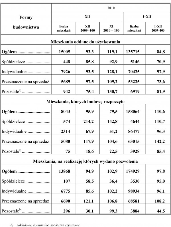 W ciągu dwunastu miesięcy 2010 r. rozpoczęto budowę 158 064 mieszkań, tj. o 10,6% więcej niż w 2009 r., natomiast wydano pozwolenia na budowę 174 929 mieszkań, tj. odpowiednio o 2,2% mniej.