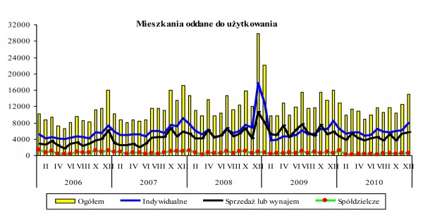 Według wstępnych danych, w okresie styczeń-grudzień 2010 r. oddano do użytkowania 135 715 mieszkań, tj. mniej o 15,2% niż w 2009 r. i o 17,8% w porównaniu z 2008 r.
