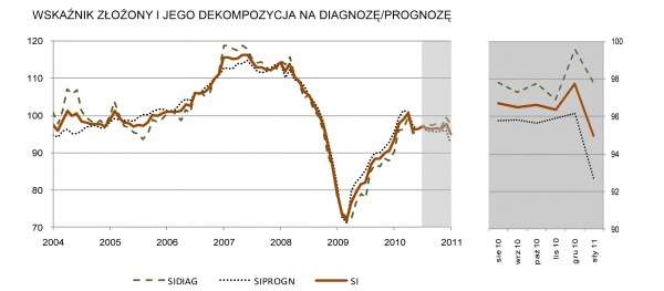 Wskaźnik syntetyczny koniunktury gospodarczej (SI)1 w styczniu br. wynosi 95,0 i jest nieco wyższy niż w analogicznym miesiącu ub. r., choć nieznacznie niższy niż w grudniu 2010 r. W podziale na pytania odnoszące się do horyzontu czasowego, w bieżącym miesiącu większy spadek wystąpił dla ocen prognostycznych niż diagnostycznych, przy czym wskaźnik diagnostyczny utrzymuje się na poziomie wyższym od prognostycznego.