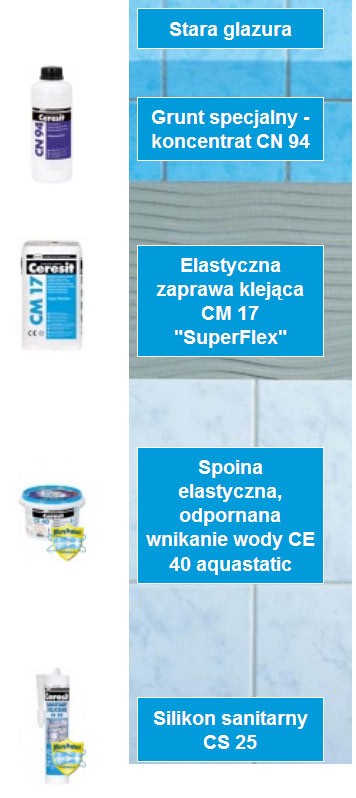 Powierzchnię starej okładziny ceramicznej należy oczyścić, usuwając substancje pogarszające przyczepność (tłuszcze, pyły itp.). Zagruntować preparatem Ceresit CN 94.