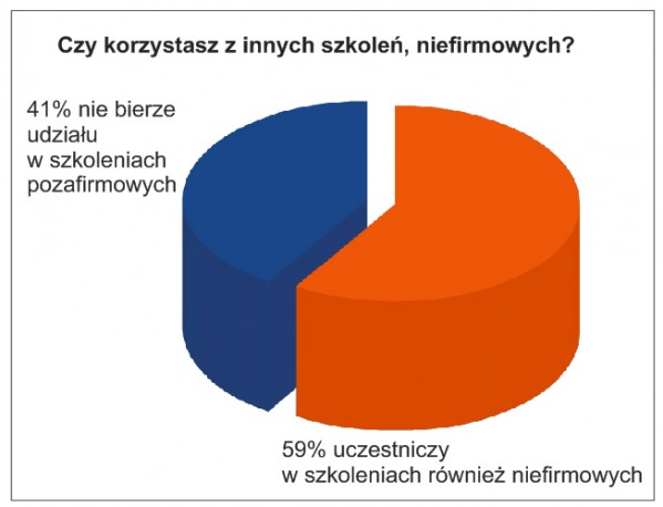 W kolejnym pytaniu ankietowani mieli się wypowiedzieć czy korzystają z innych szkoleń, ale nieorganizowanych przez firmy, producentów m.in. chemii budowlanej, czyli tzw. szkoleń firmowych. Na „Tak” odpowiedziało 48 osób, czyli 41% ankietowanych. „Nie” - nie uczestniczyło w żadnych szkoleniach niefirmowych 68 osób, spośród 116 pytanych glazurników, co stanowi 59% badanej grupy.
