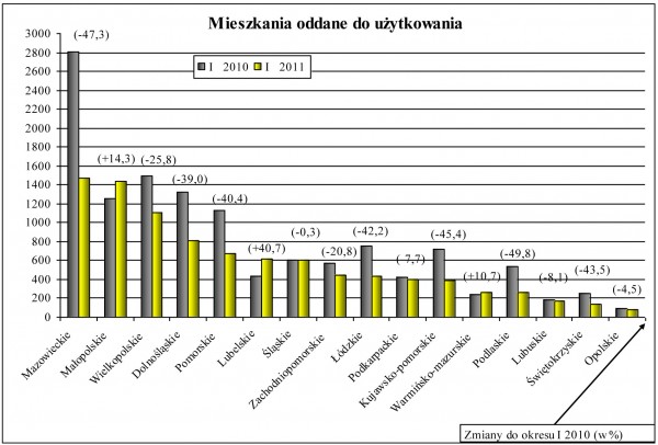 W styczniu 2011 r. rozpoczęto budowę 6 247 mieszkań, tj. o 40,4% więcej niż w 2010 r., natomiast wydano pozwolenia na budowę 9 612 mieszkań, tj. odpowiednio o 9,2% mniej.