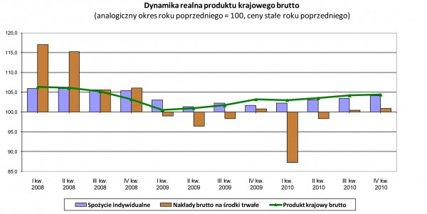 PKB niewyrównany sezonowo (w cenach stałych średniorocznych roku poprzedniego) wzrósł realnie o 4,4% w porównaniu z analogicznym okresem roku poprzedniego. W IV kwartale 2010 r. czynnikiem wzrostu PKB był popyt krajowy (wpływ na tempo wzrostu gospodarczego wyniósł 5,6 pkt. proc.). Wpływ spożycia ogółem wyniósł 3,2 pkt. proc., a akumulacji 2,4 pkt. proc. (z tego 0,3 pkt. proc. - wpływ popytu inwestycyjnego i 2,1 pkt. proc. - wpływ zmiany zapasów). Ujemny wpływ popytu zagranicznego (eksportu netto) wyniósł -1,2 pkt. proc.