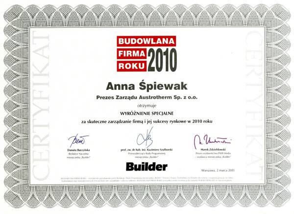Austrotherm, zgodnie z decyzją Redakcji i Rady Programowej Buildera, znalazł się w zaszczytnym gronie laureatów i został uhonorowany tytułem Budowlanej Firmy Roku 2010 za dynamiczny rozwój firmy i osiągniętą pozycję na rynku. Prezes Zarządu Austrotherm, Anna Śpiewak otrzymała wyróżnienie specjalne za skuteczne zarządzanie firmą i jej sukcesy rynkowe w 2010 roku. Anna Śpiewak, odbierając wyróżnienie z rąk Krystyny Boczkowskiej Prezes Bosch Sp. z o.o. podkreśliła, że to prestiżowe wyróżnienie jest dla nas szczególnie cenne, gdyż przyznane zostało przez niezależne grono ekspertów, znawców branży budowlanej i docenia wysiłek oraz zaangażowanie wszystkich naszych pracowników. Dziękujemy naszym Klientom i gratulujemy pozostałym laureatom, a wszystkim życzymy zdrowej konkurencji.Firma Austrotherm po raz kolejny potwierdziła sukcesy w budowaniu silnej marki oraz najwyższej jakości oferowanych produktów.