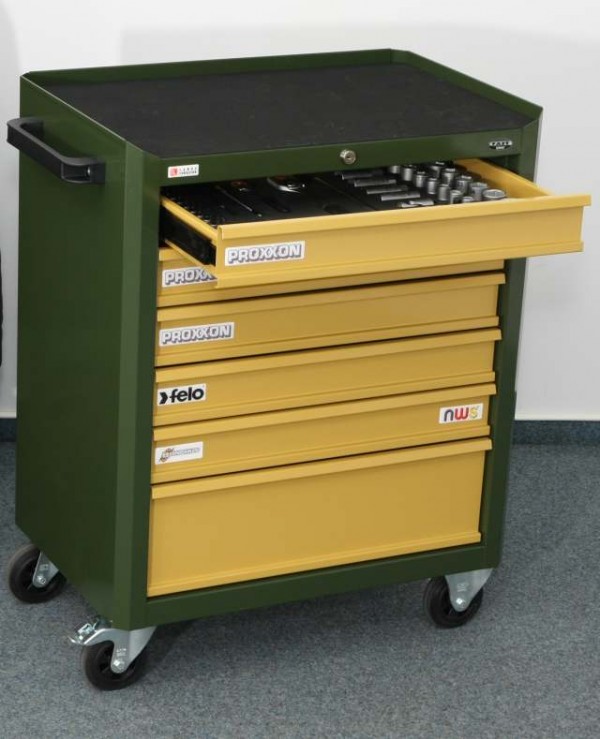 Wózki są wykonane z grubej, sztywnej, trudno odkształcalnej blachy pomalowanej proszkowo w łagodnych kolorach nawiązujących do logo firmy Proxxon. Szuflady, których jest w zależności od typu wózka 6 lub 7, otwierają się łatwo i miękko - bez zbędnych oporów. Ich uchwyty wyprofilowano w taki sposób, aby można było nimi pewnie i łatwo operować. Na każdej szufladzie widnieje stosowna informacja, jakiej marki narzędzia zawiera. Gąbka wyściełająca wnętrza szuflad jest odpowiedniej sztywności. Wycięcia pod poszczególne klucze wykonano w bardzo precyzyjny sposób. Dzięki temu narzędzia w wózkach są mocno zaciśnięte, a tym samym prawidłowo ustabilizowane. Pomyślano również o dodatkowych wycięciach, które umożliwiają użytkownikowi przechowywanie drobnych akcesoriów według własnych, indywidualnych potrzeb. Dolna - pusta szuflada - pozwala na ewentualne dodatkowe doposażenie lub też przetrzymywanie innego sprzętu.