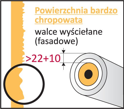 Jeżeli powierzchnia jest szorstka, wybierzemy walec z dłuższym runem 13-22mm (Maxprofi, Elitakolor, Multikolor, Hardex, Eko). Wnika ono w mikroszczeliny tynku i dzięki temu równomiernie rozprowadza farbę. Jeżeli natomiast chcemy pomalować elewację, wybierzemy wałek wyściełany o długości runa powyżej 22mm.