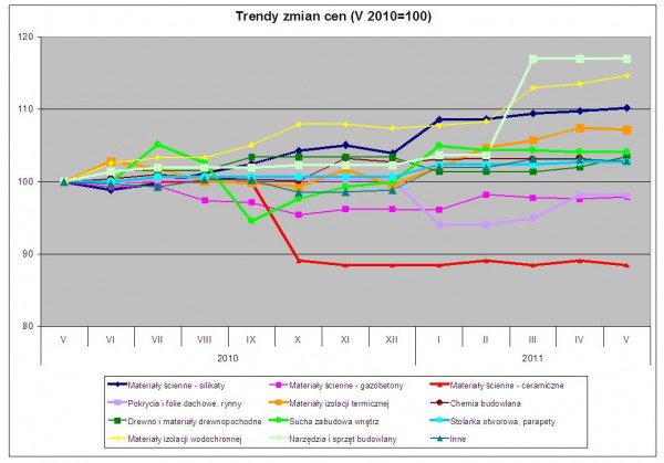 W maju 2011 r., w porównaniu do poprzedniego miesiąca, wzrosły ceny w 4 grupach towarowych, w tym: drewna i materiałów drewnopochodnych (+1,4%), materiałów izolacji wodochronnej (+1%), silikatów (+0,4%) i gazobetonów (+0,3%). Spadki cen były również niewielkie: materiałów ściennych ceramicznych i chemii budowlanej (po 0,7%) oraz izolacji termicznej (o 0,2%). W pozostałych 4 grupach ceny nie zmieniły się.