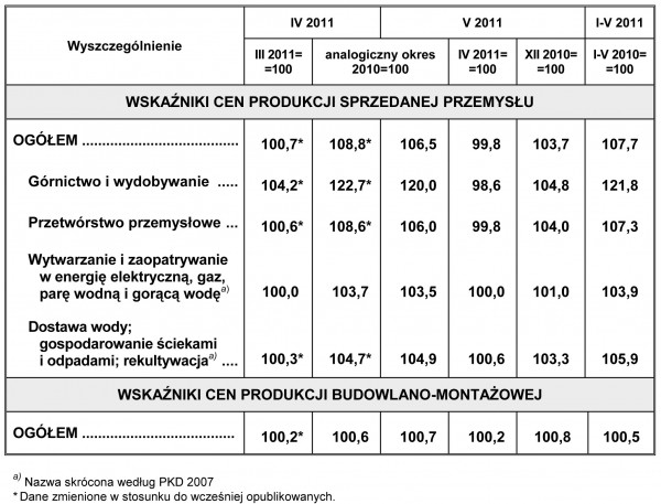 W maju 2011 r. ceny produkcji sprzedanej przemysłu były o 6,5% wyższe niż przed rokiem. Najbardziej podniesiono ceny w górnictwie i wydobywaniu (o 20,0%). Wzrosły również ceny w sekcjach: przetwórstwo przemysłowe (o 6,0%), dostawa wody; gospodarowanie ściekami i odpadami; rekultywacja (o 4,9%) oraz wytwarzanie i zaopatrywanie w energię elektryczną, gaz, parę wodną i gorącą wodę (o 3,5%).