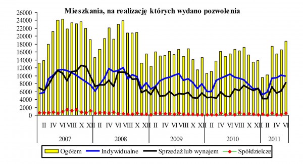 Największy udział (60,7%) w przyroście nowych zasobów mieszkaniowych mieli inwestorzy indywidualni, którzy w okresie styczeń-czerwiec 2011 r. wybudowali o 3,4% więcej mieszkań niż przed rokiem, tj. 33612. W tej grupie inwestorów odnotowano niewielki spadek pozwoleń na budowę - do 49746 mieszkań, tj. o 0,8% mniej niż przed rokiem, natomiast wzrost liczby mieszkań, których budowę rozpoczęto - 48508 mieszkań, tj. o 7,4% więcej niż w analogicznym okresie 2010 r.
