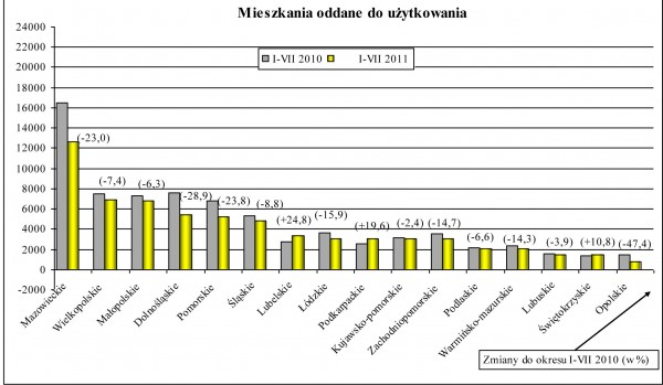 Według wstępnych danych, w okresie styczeń-lipiec 2011 r. oddano do użytkowania 65 249 mieszkań, tj. o 13,5% mniej niż w 2010 r. i o 28,8% mniej w porównaniu z okresem styczeń-lipiec 2009 r.