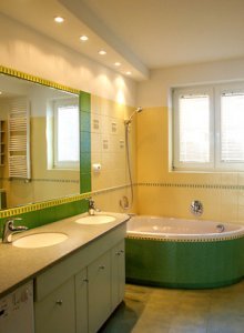 Czas relaksuStrefa wypoczynkowa łazienki powinna, aczkolwiek nie musi, odbiegać klimatem od części sanitarno-kąpielowej. Tutaj ustawiamy fotel, leżaki czy przyrządy gimnastyczne. Odrębność tego miejsca podkreślić mogą innego koloru i rozmiaru płytki, stylowe szafy, komódki do przechowywania przyborów toaletowych czy ręczników oraz odpowiednie oświetlenie. Stosując oprawy boczne i operując kolorami, osiągniemy pożądany nastrój. Należy w sposób przemyślany tak dobierać wyposażenie, aby jego kolor współgrał z powierzchnią ścian i podłóg.