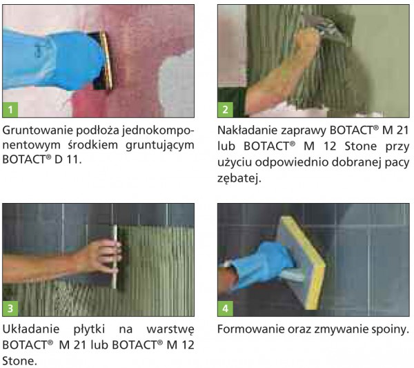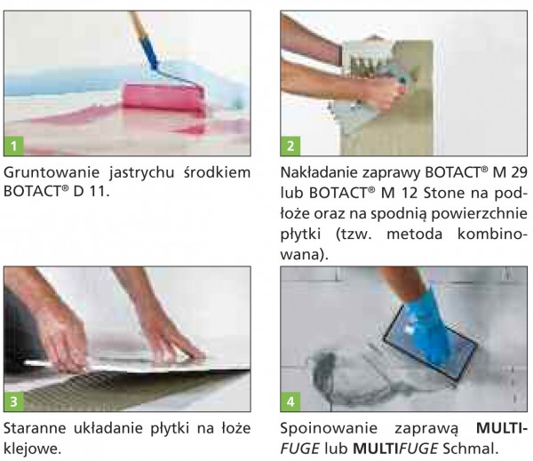 Układanie płytek ceramicznych oraz kamienia naturalnego na podłożu z metalu, drewna, tworzyw sztucznych, jak również na innych sprawiających trudności podłożach stanowi często dla wykonawcy duże wyzwanie. BOTACT PU 550 dzięki niezwykle wysokiej przyczepności, wytrzymałości oraz elastyczności stanowi idealne rozwiązanie dla takich krytycznych zastosowań. Jeżeli dodatkowo wymagane jest wygłuszenie podłoża, zalecamy zastosowanie BOTACT płyty tłumiąco-kompensującej.