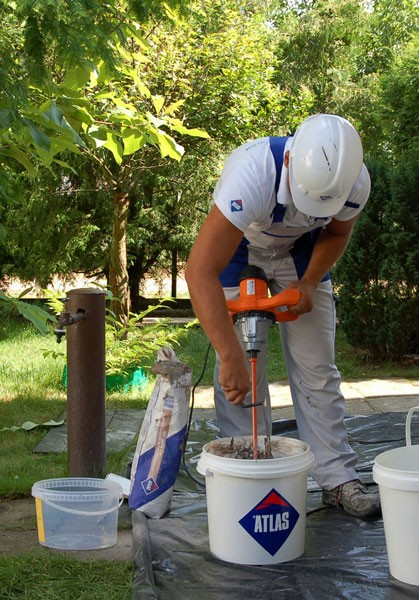 Zaprawę miesza się mechanicznie, specjalnie do tego przystosowanym mieszadłem, zamocowanym w wolnoobrotowej wiertarce. Fot. ATLAS Według instrukcji