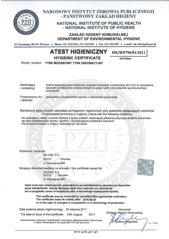 Atest Higieniczny HK/B/0796/01/2011 wydany przez Narodowy Instytut Zdrowia Publicznego – Zakład Higieny Komunalnej dla Mozaikowych Tynków Dekoracyjnych Tytan EOS Fot. Selena SANowe Mozaikowe Tynki Dekoracyjne TYTAN EOS otrzymały Atest Higieniczny HK/B/0796/01/2011 wydany przez Narodowy Instytut Zdrowia Publicznego. Produkty nie emitują żadnych szkodliwych substancji do powietrza, pozostając całkowicie przyjaznymi w trakcie normalnego użytkowania, zgodnie z załączoną kartą techniczną. Atest wydano na podstawie dokładnego opisu technicznego wyrobu, zawierającego skład chemiczny, przeznaczenie oraz wyniki badań wpływu na środowisko. Zgodnie ze Świadectwem z zakresu Higieny Radiacyjnej Nr HR/B/47/2011, wydanym dnia 20.06.2011 przez Zakład Ochrony Radiologicznej i Radiobiologii Narodowego Instytutu Zdrowia Publicznego - Państwowego Zakładu Higieny w Warszawie, Mozaikowe Tynki Dekoracyjne TYTAN EOS są bezpieczne pod kątem zawartości naturalnych izotopów promieniotwórczych potasu K-40, radu Ra-226 i toru Th-228. Tym samym nie stwarzają zagrożenia radiacyjnego dla mieszkańców budynków, w których zostały zastosowane.